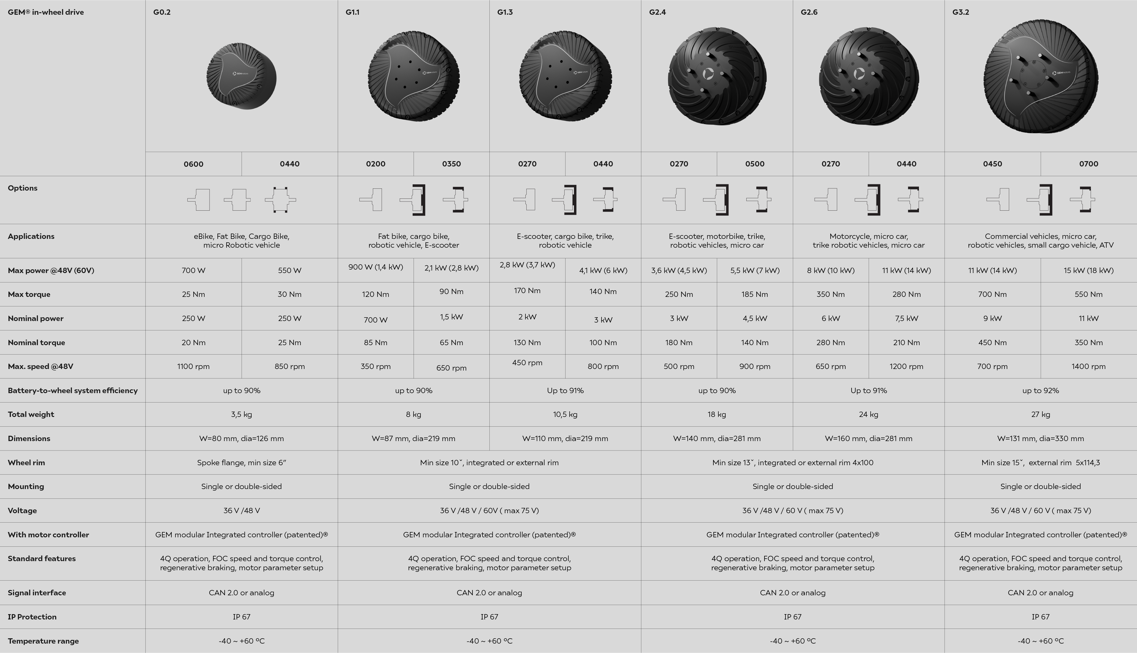 GEM in-wheel drive represents one of the most advanced propulsion systems for urban electric vehicle applications, using patented modular multiphase GEM technology. It is suitable for electric two, three and four wheeler applications and robotic vehicles due to modular mounting options and different speed versions. Fully integrated drive operates in a safe low voltage regime using air cooling system. Innovative modular design allows development of a complete product porfolio at power level from 1 kW to 15 kW and can be further customized to special requiremetns.