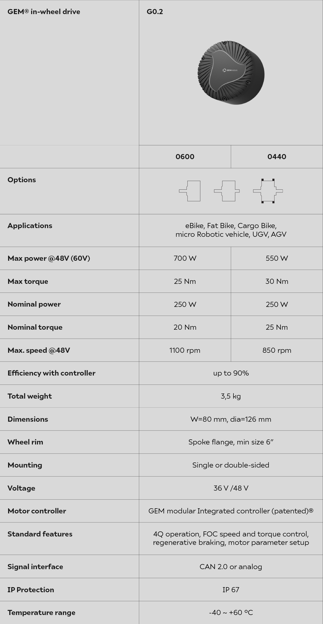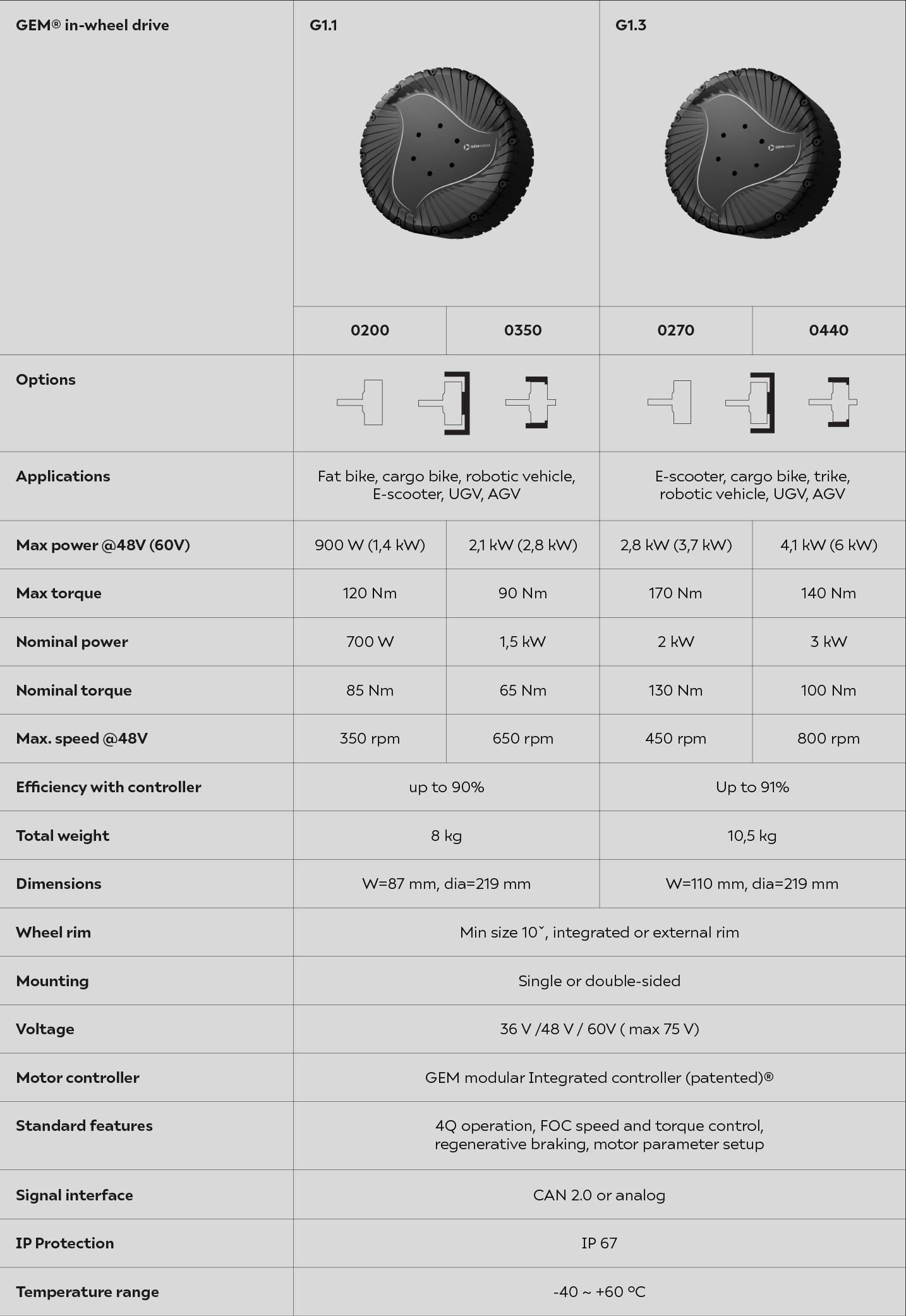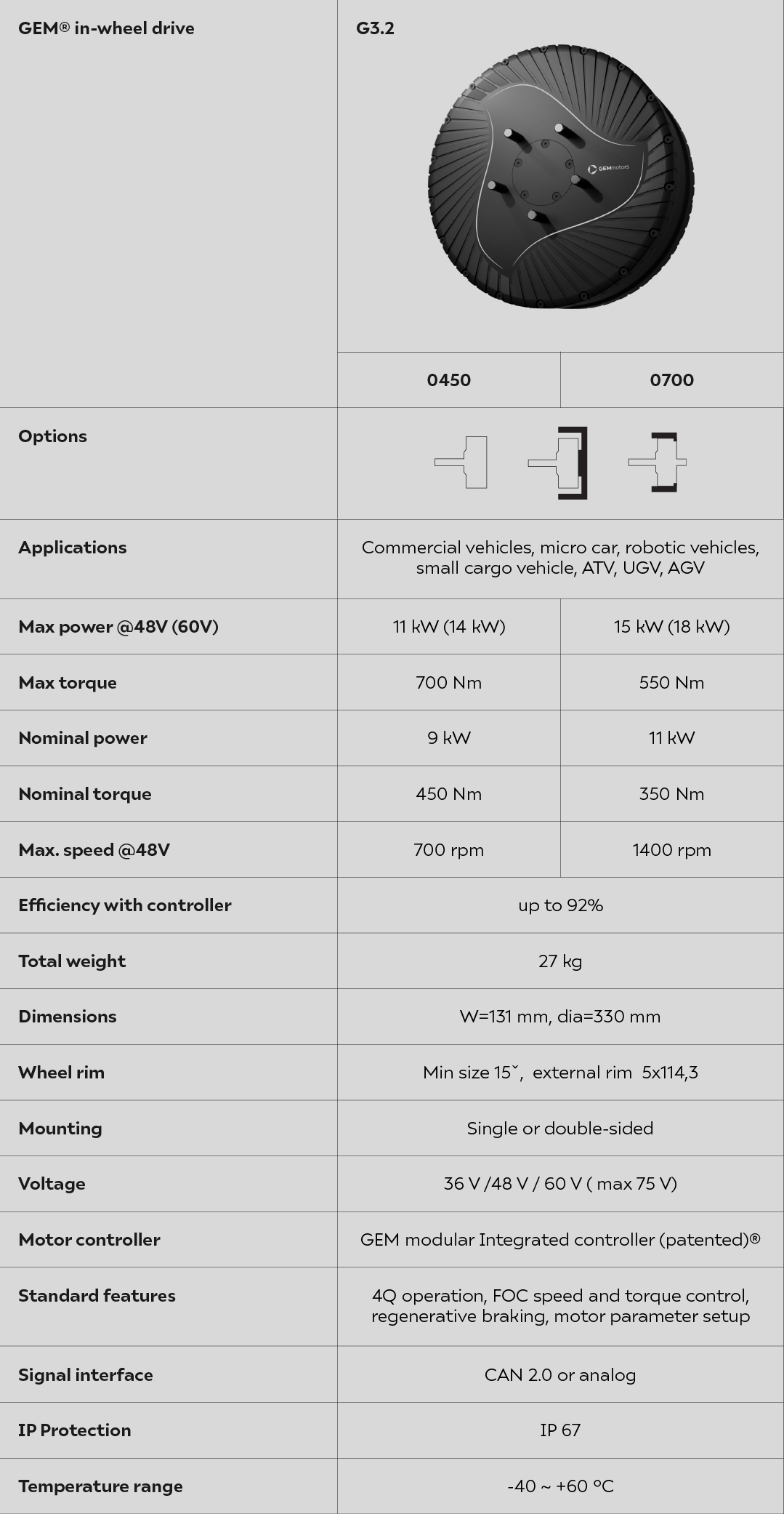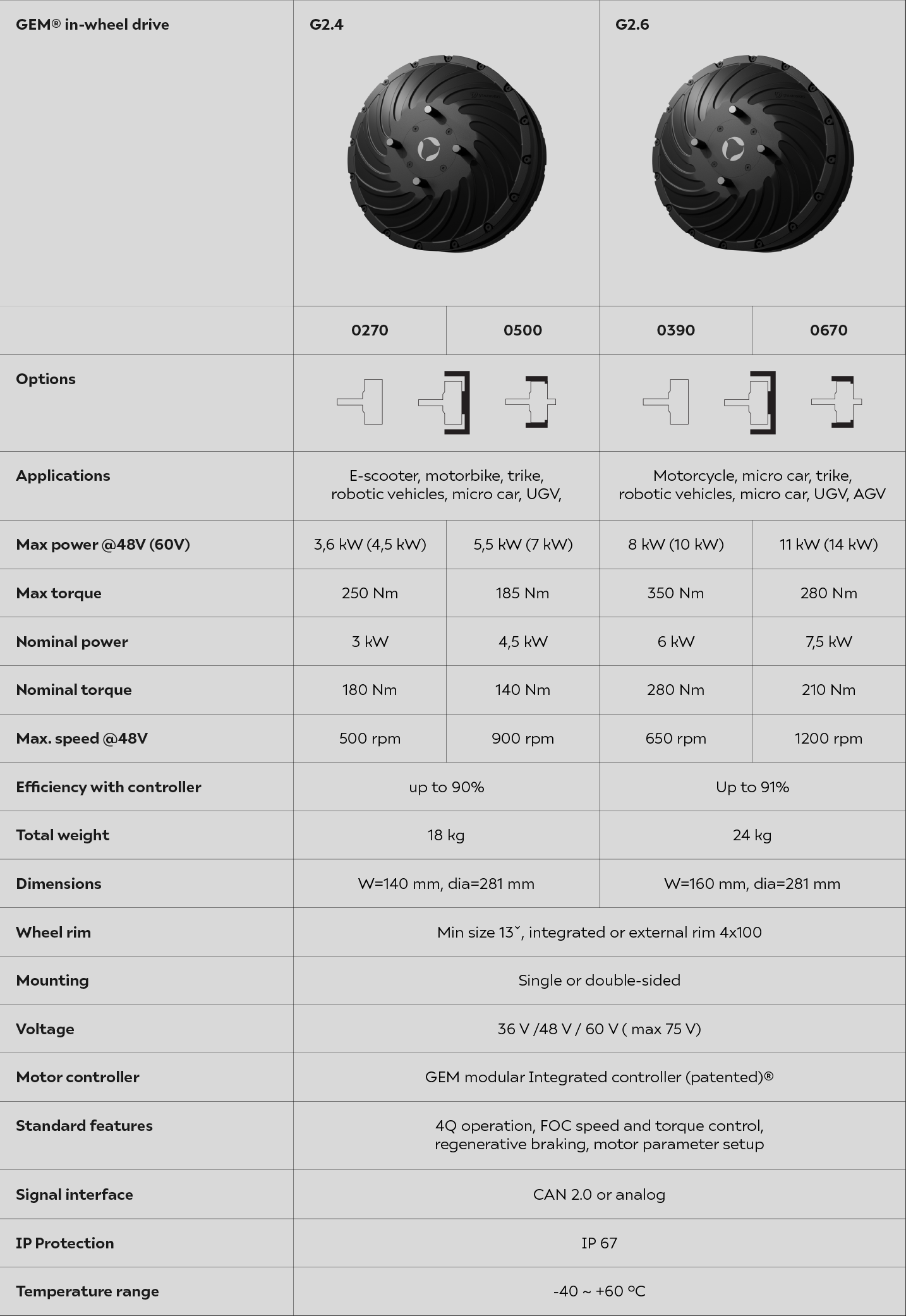 Our product GEM in-wheel drive is one of the most advanced propulsion system for urban e-vehicles, due to its patented modular multiphase GEM technology. Modular mounting options and different speed and power versions allows easy integration into electric two, three and four wheeler applications. This fully integrated in-wheel drive operates in a safe low voltage regime using air cooling system. The innovative modular allows a complete product porfolio at a power level from 250W to 15 kW and it can be further customized to meet special requirements. Together with other products such as integrated rim, disc brake system and GEM VCU unit, provides a complete e-drive solution for the most advanced vehicle designs.