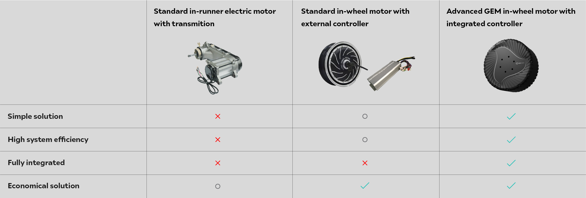 The in-wheel solution introduces some significant advantages compared to the central motor with transmission, which is a rather heavy and complex propulsion system. GEM in-wheel drive offers an optimized direct-drive propuslion with high torque and increased overall efficiency. It is in line with future trends of highly integrated solutions, reducing weight, space and number of parts for electric propulsion.
